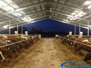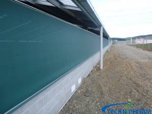 Curtains or screens are the key to create the right environment inside the cowhouse. It is important that the total ventilation be calculated and checked on every build project. Ventilation design is subject to the size of the facility, its location, site specific limitations and the size of the herd housed and the time of year mainly used. Expert advise is recommended. Curtains can come fixed and adjustable the latter allows a greater variable of climate control. (summer, Winter) Curtain material is specific to use for cowhouse use, it is not windbreak material, but a specific blend of PVC which allows wind screening and rain diversion