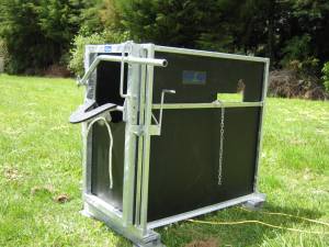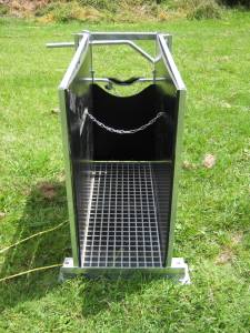 A simple but very effective calf handler to hold the calf securely for dehorning/tagging and other jobs. Equipped with holding jaw brace and backup chain. Easy close and open headbail. Can be mounted on weighbars for weighing to confirm progress weightgain. Great to take to farm for dehorning work or general vet work. Or rent out to farmers for them to do their own work.